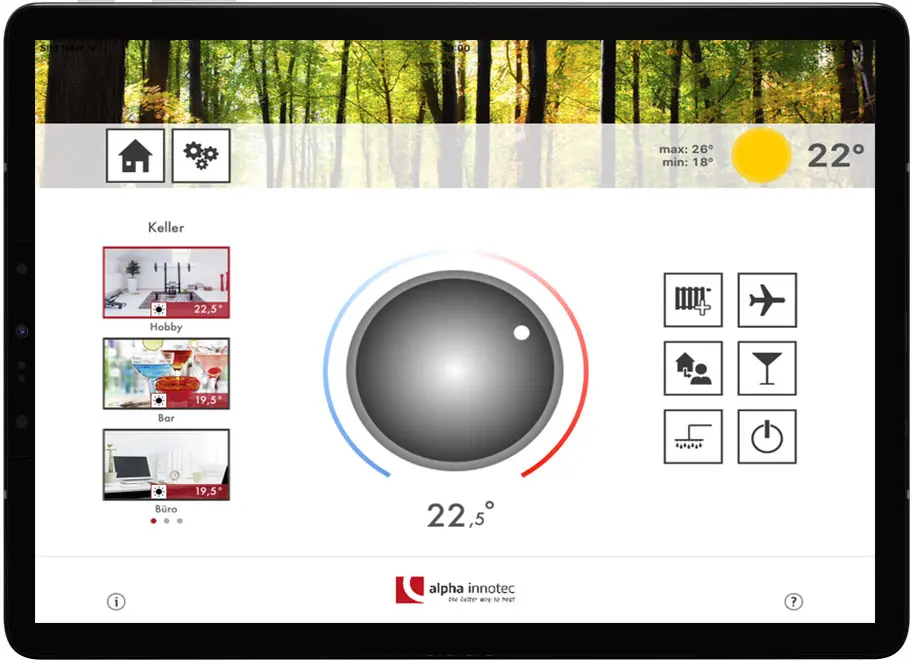 Das Regelungssystem ist perfekt auf die Rahmenbedingungen, die Wärmepumpe und die individuellen Bedürfnisse abgestimmt. alpha home hält immer die jeweils über die App vorgegebene Temperatur. Für jeden Raum, individuell und unter Berücksichtigung externer Faktoren wie z.B. Frühlingssonne oder Kaminfeuer.